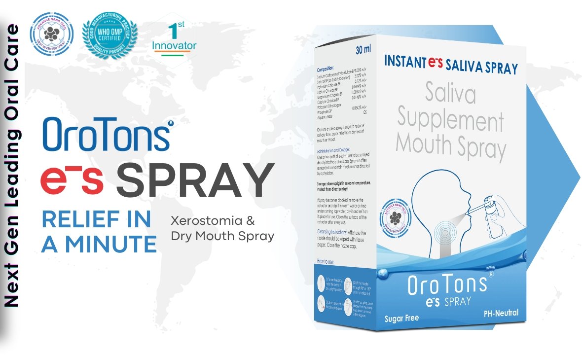 OroTons E-Saliva Spray revitalizes oral comfort by combatting xerostomia and alleviating dry mouth symptoms.